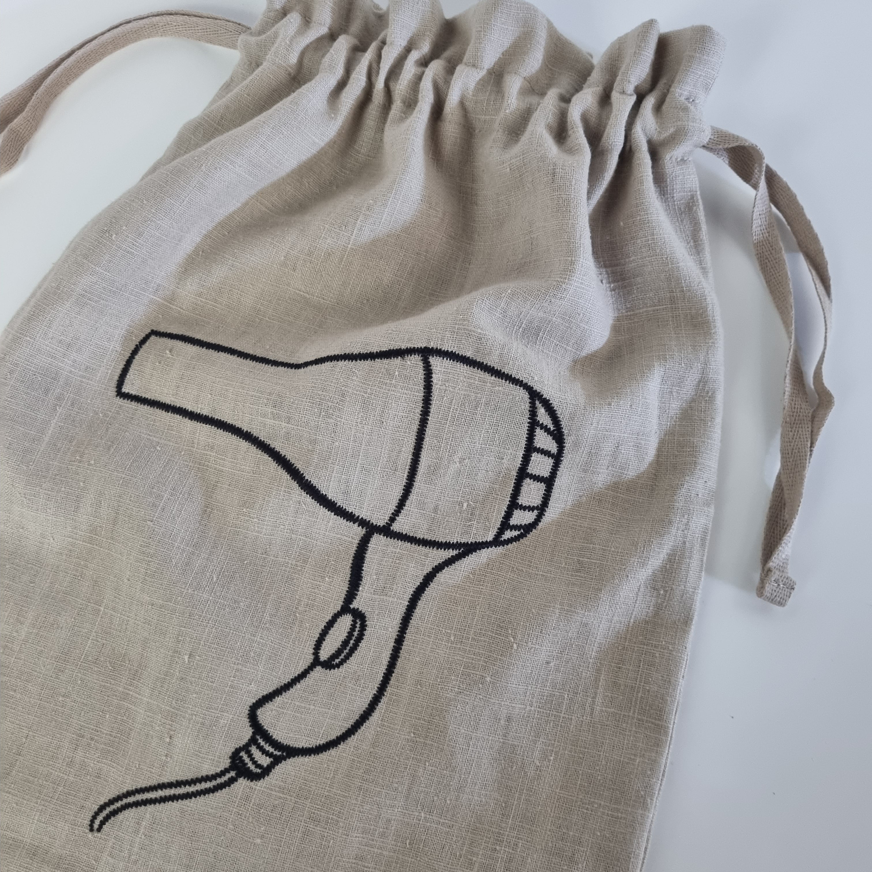 This cotton hair dryer bag features elegant black embroidery, combining durability with style. Its soft fabric protects your hair dryer from dust and scratches, making it ideal for travel or storage. Compact and lightweight, it’s designed to keep your styling tools organised and easily accessible.