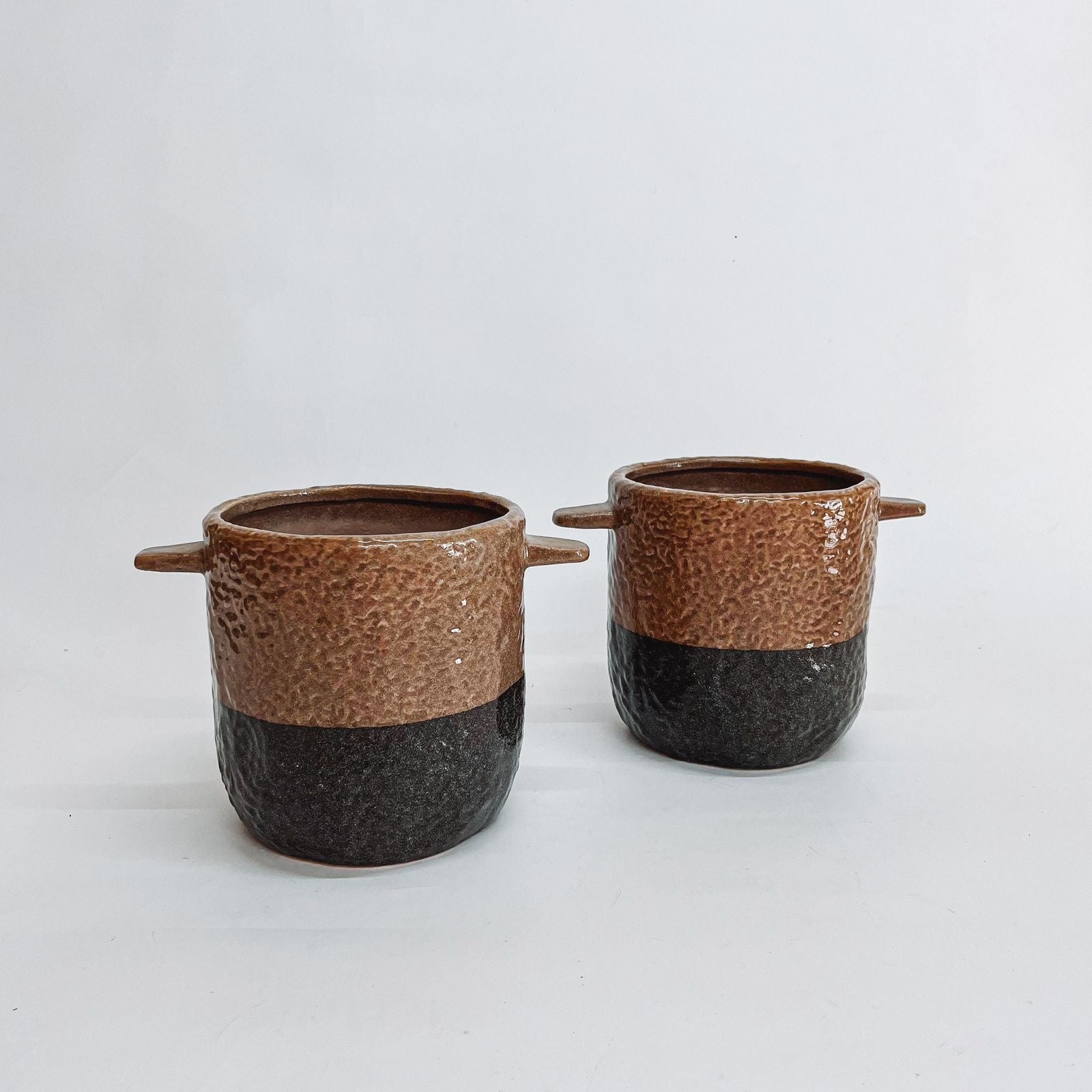 This two-toned pot in brown and black offers a blend of natural warmth and bold contrast. Its earthy tones bring a grounded feel to your space, while the handles add both visual interest and functionality. Whether used for plants or as a decorative piece, this pot's rich color palette complements various interior styles.