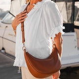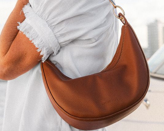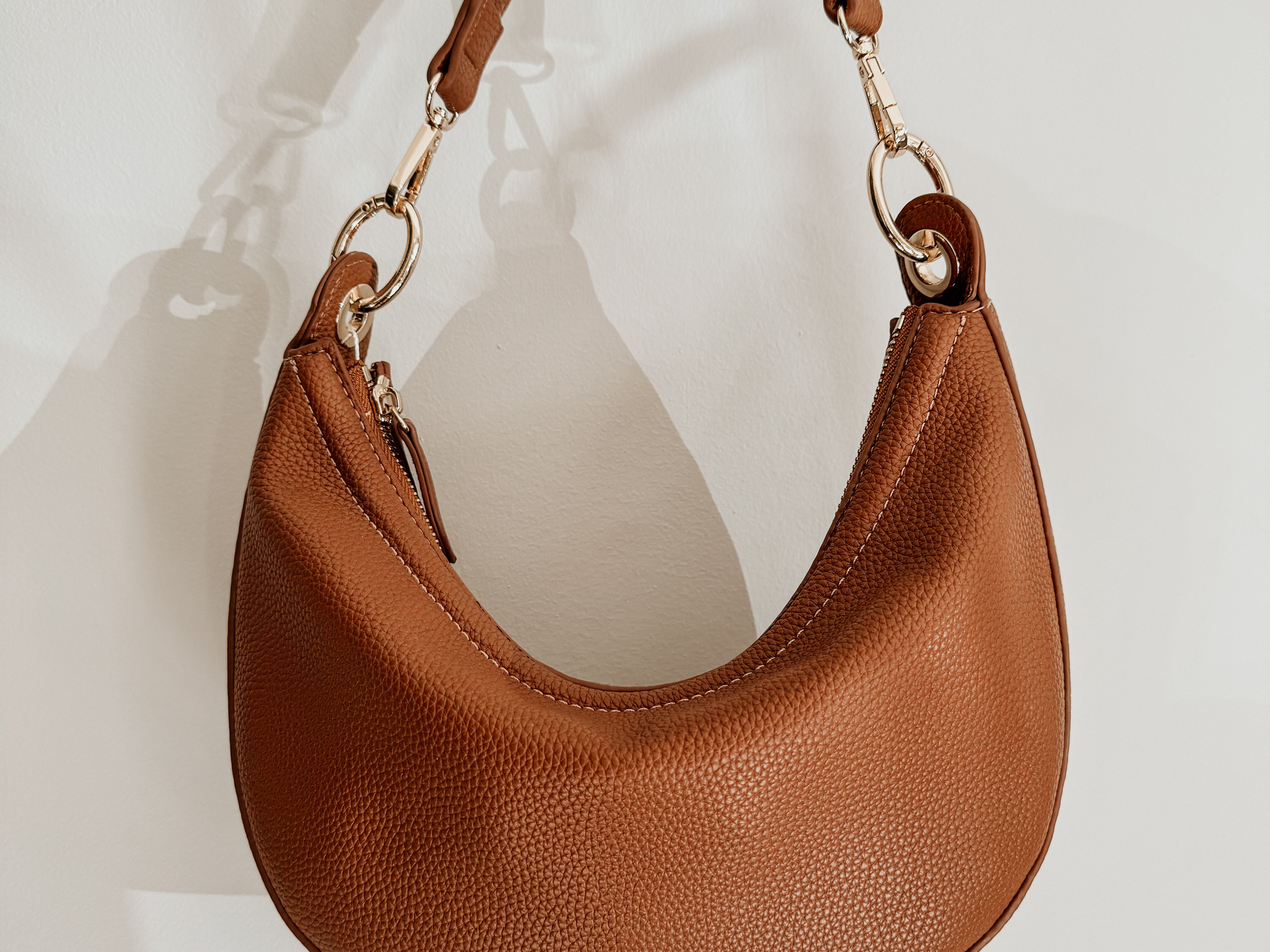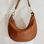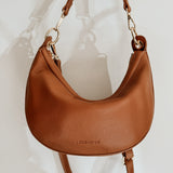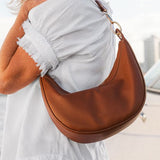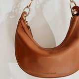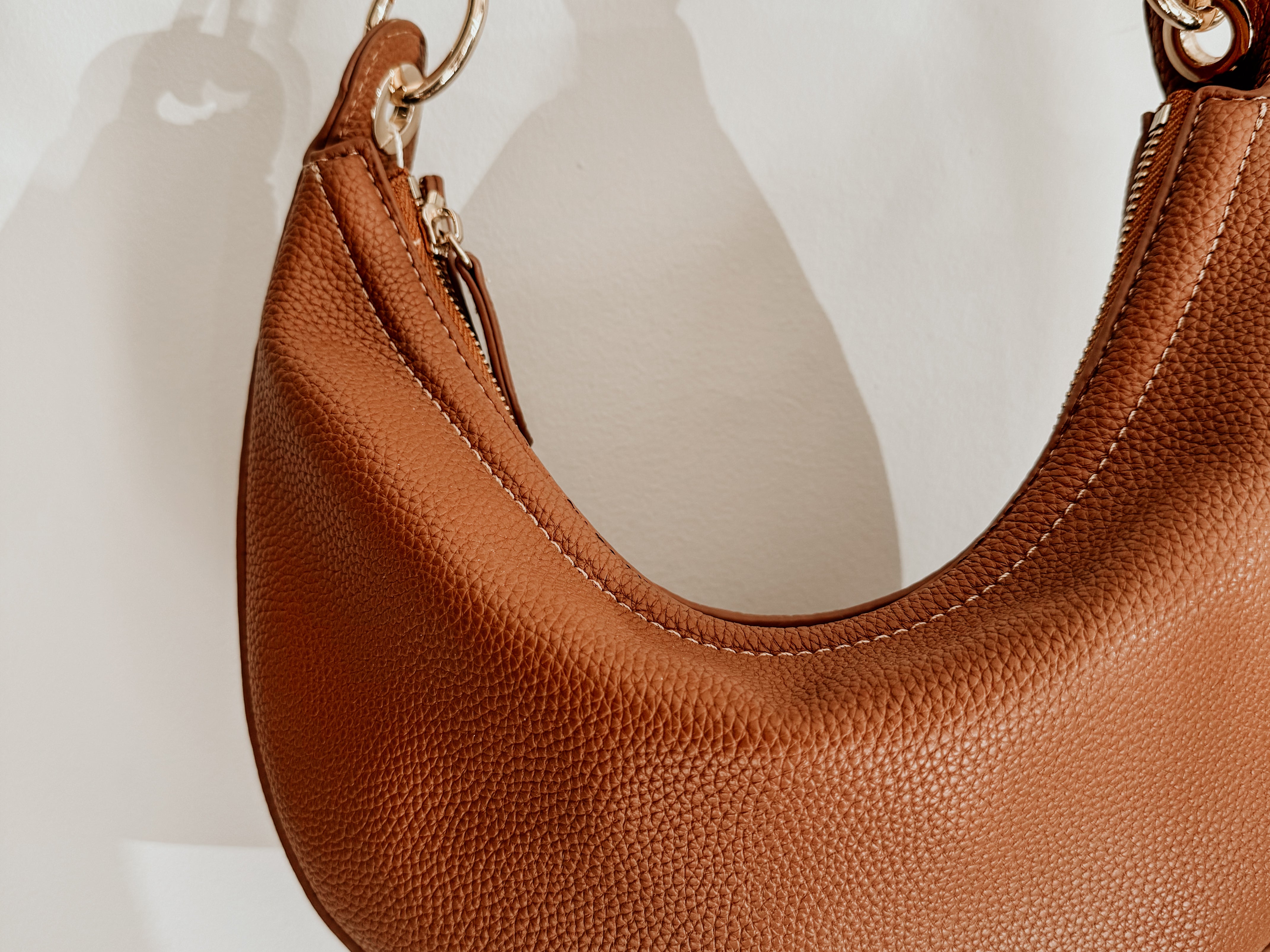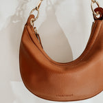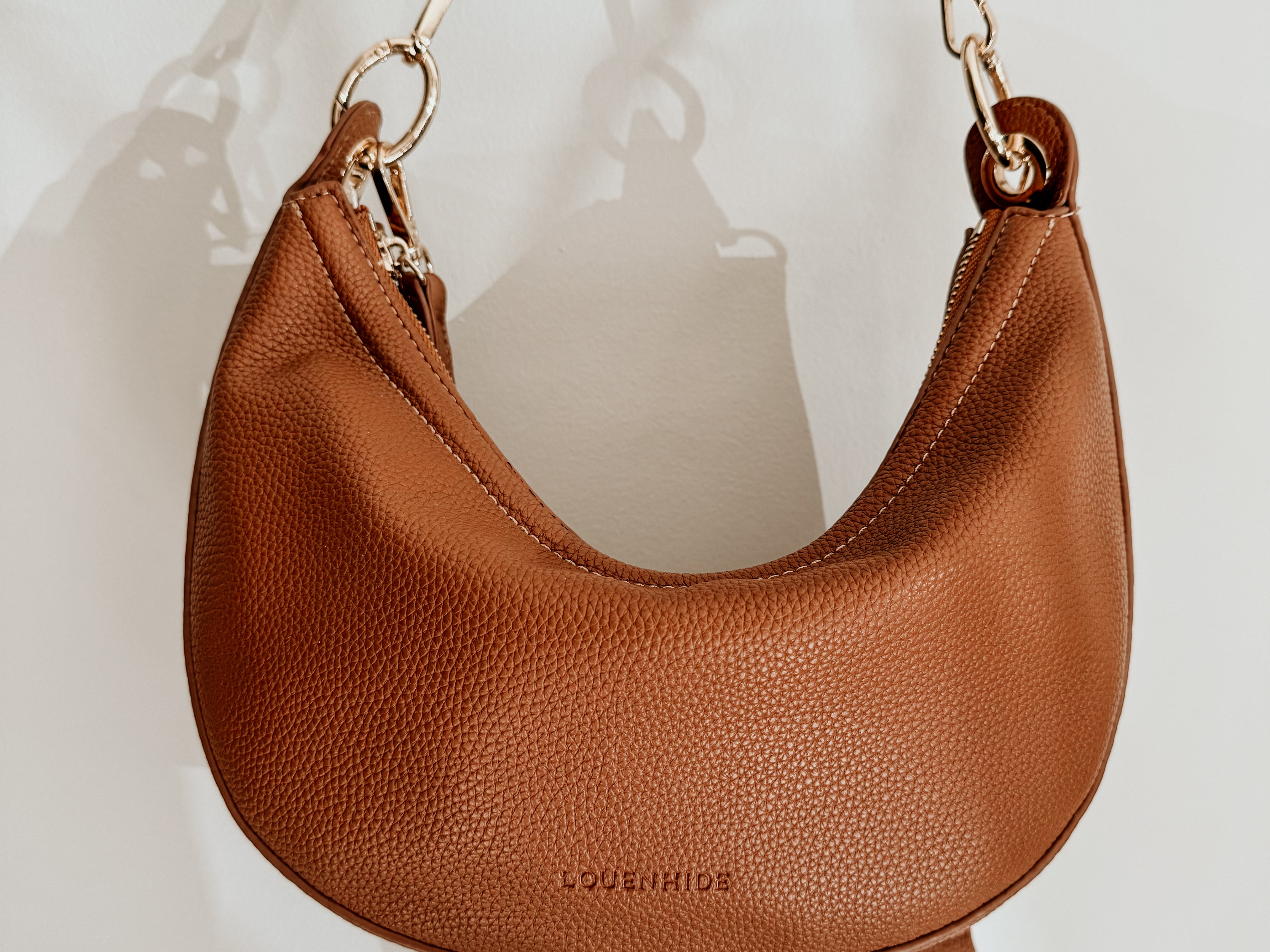 The Louenhide Corfu Tan Handbag is a stunning accessory that combines function and style flawlessly. She flaunts a crescent moon silhouette that is impossible to ignore and she will add a touch of simplicity yet intrigue to your outfit.