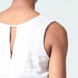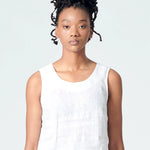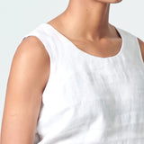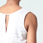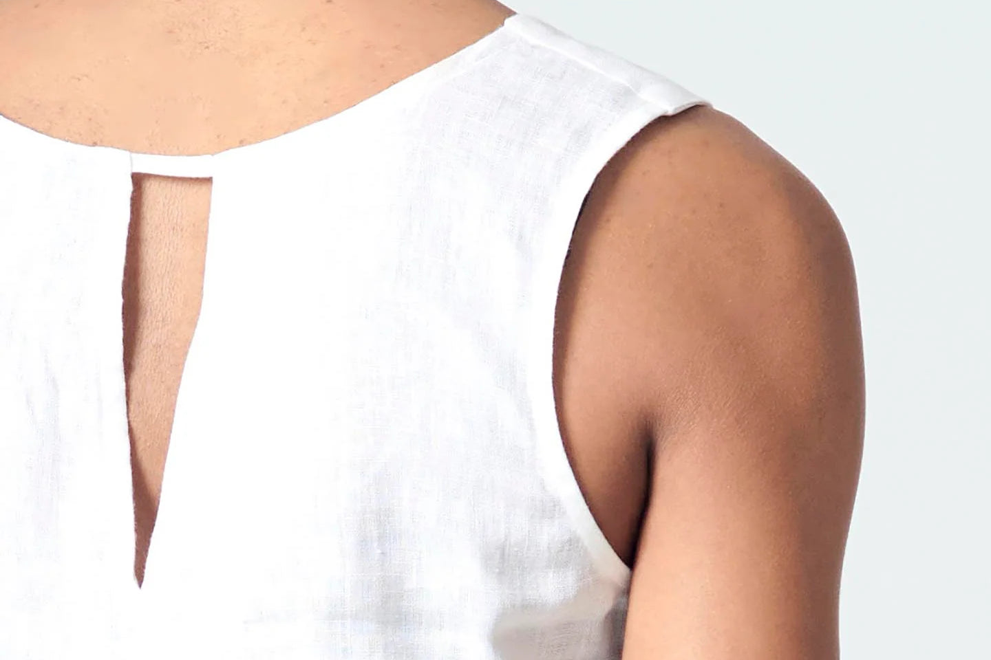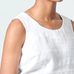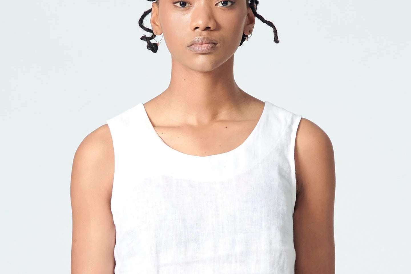The Cross is a must-have; its short length complements any bottom. Made from 100% white slub weave linen, it features unique stitch details and a stylish keyhole back.