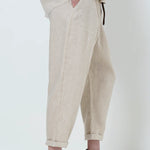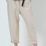The Jean pants are an easy elasticated waist drop crotch bottom with pockets, belt loops and a tapered leg that can be rolled up.