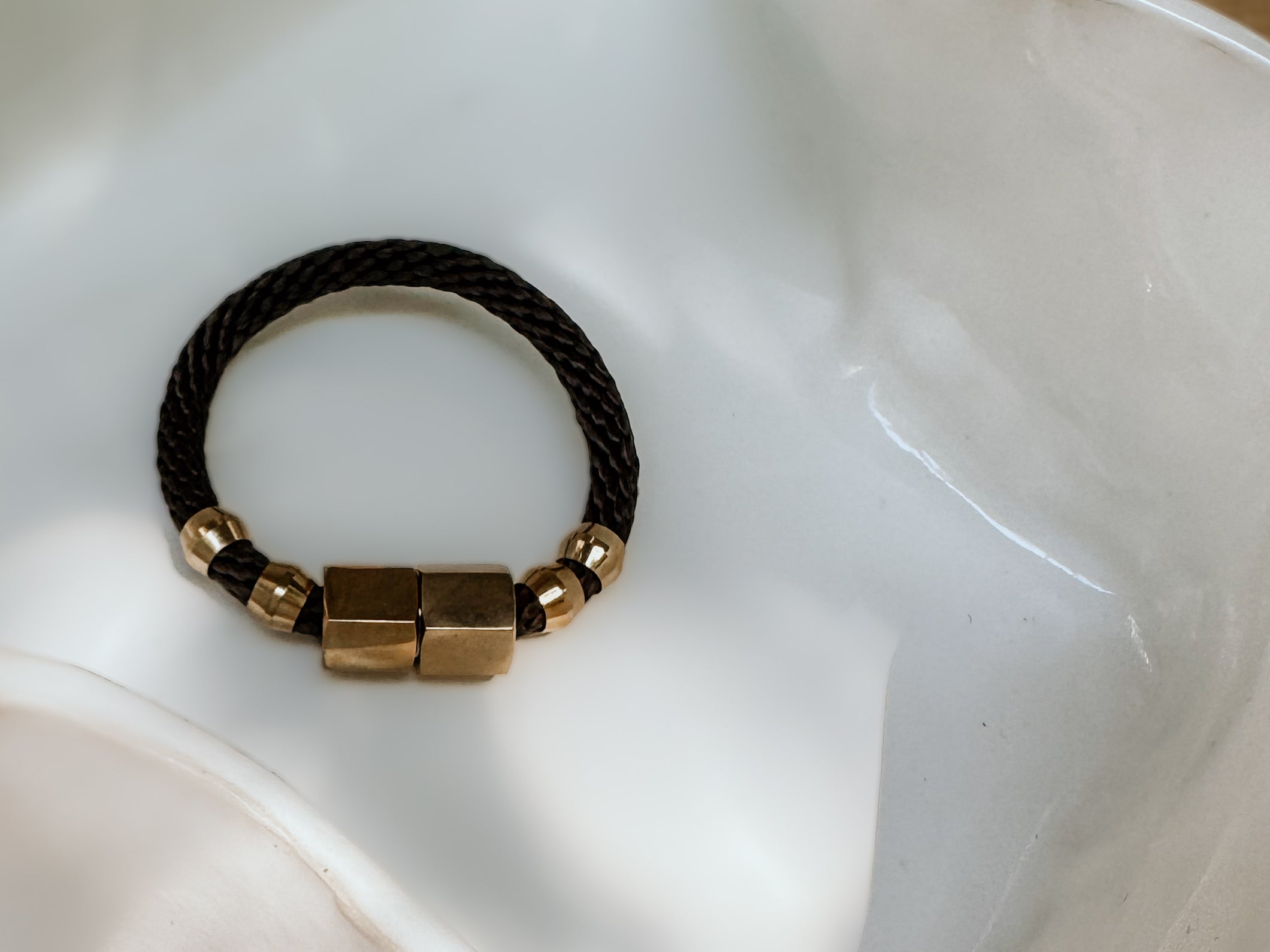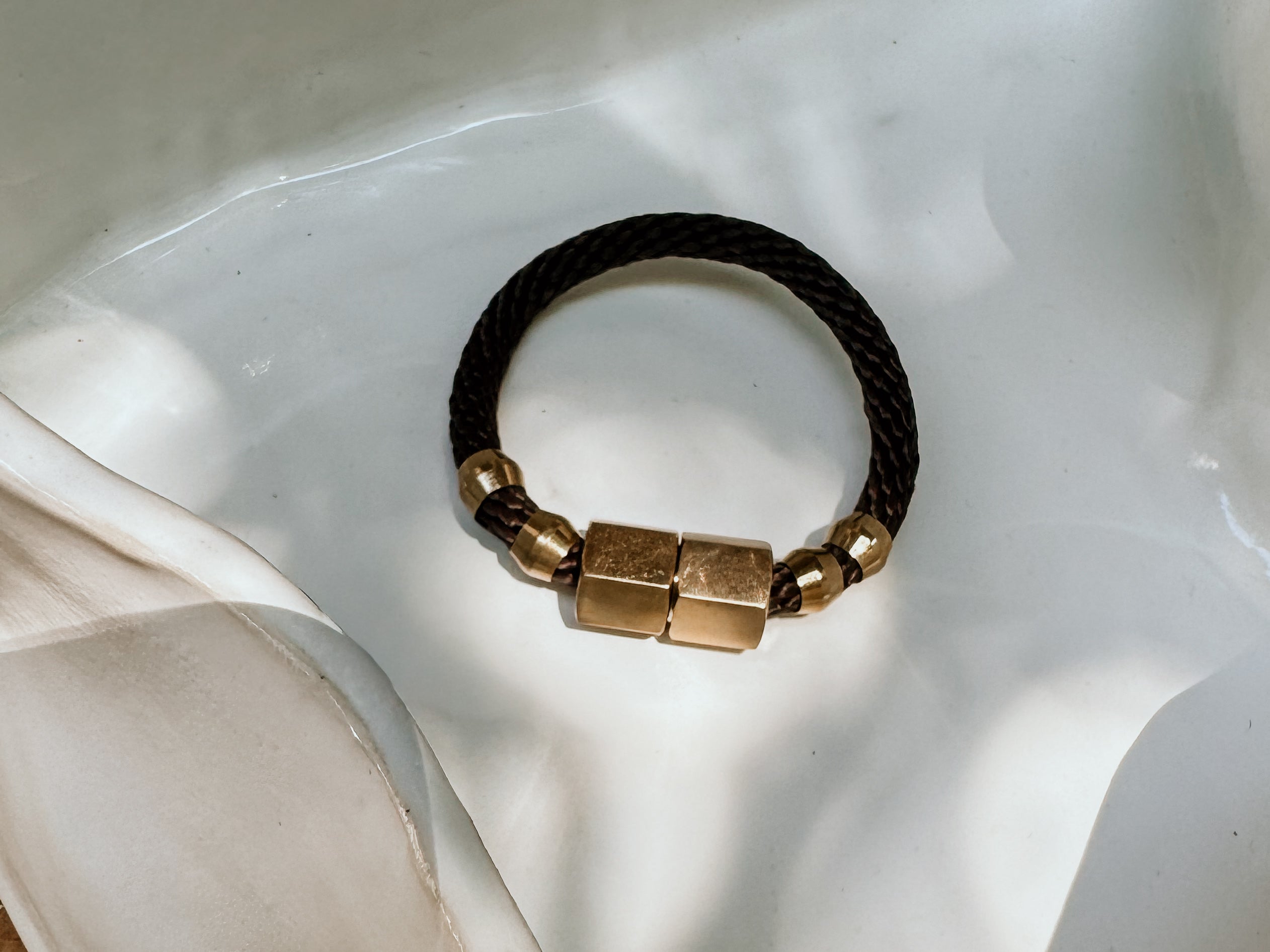 Braided rope and brass rings closed with a magnetic brass clasp.