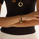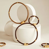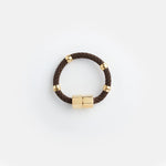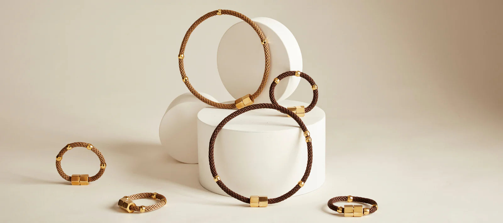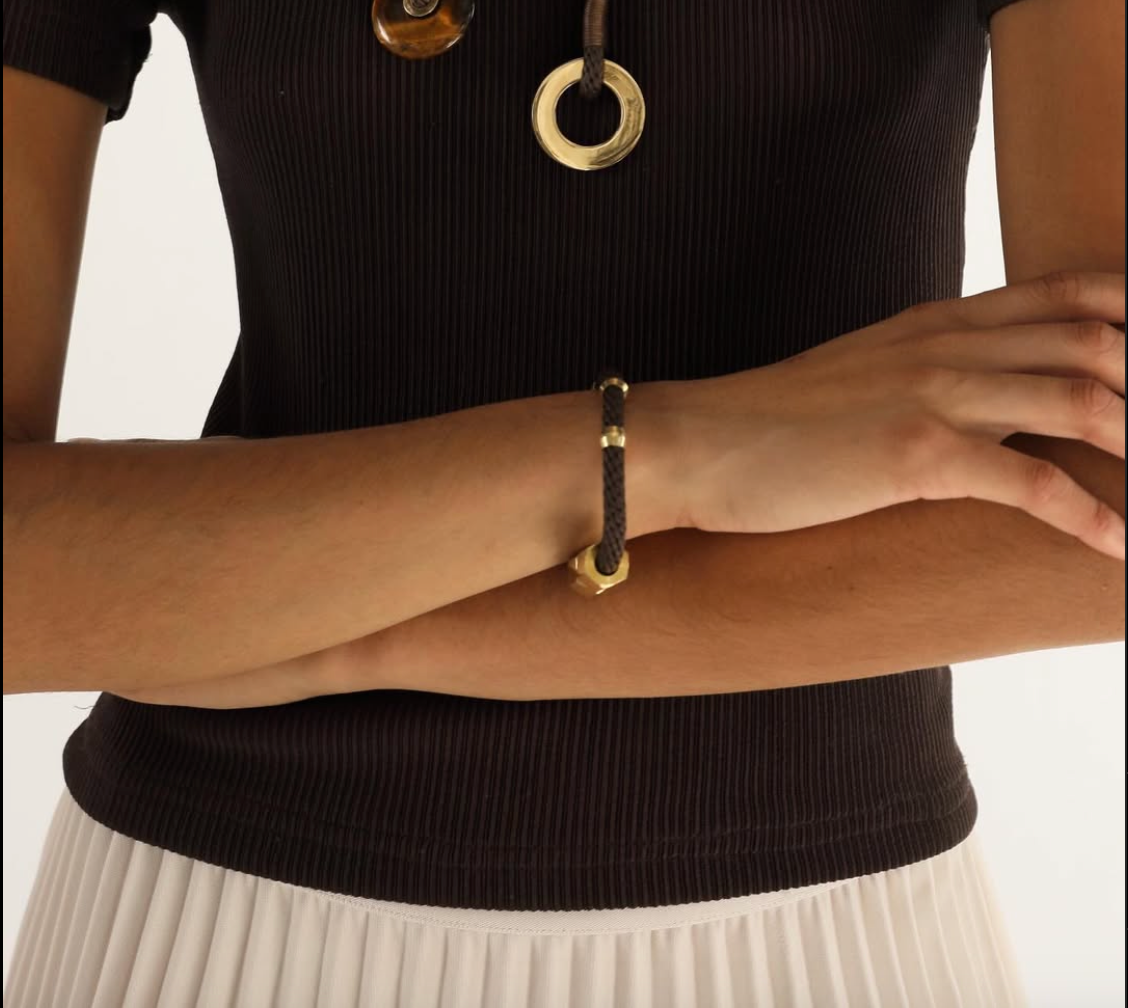 Braided rope and brass rings closed with a magnetic brass clasp.