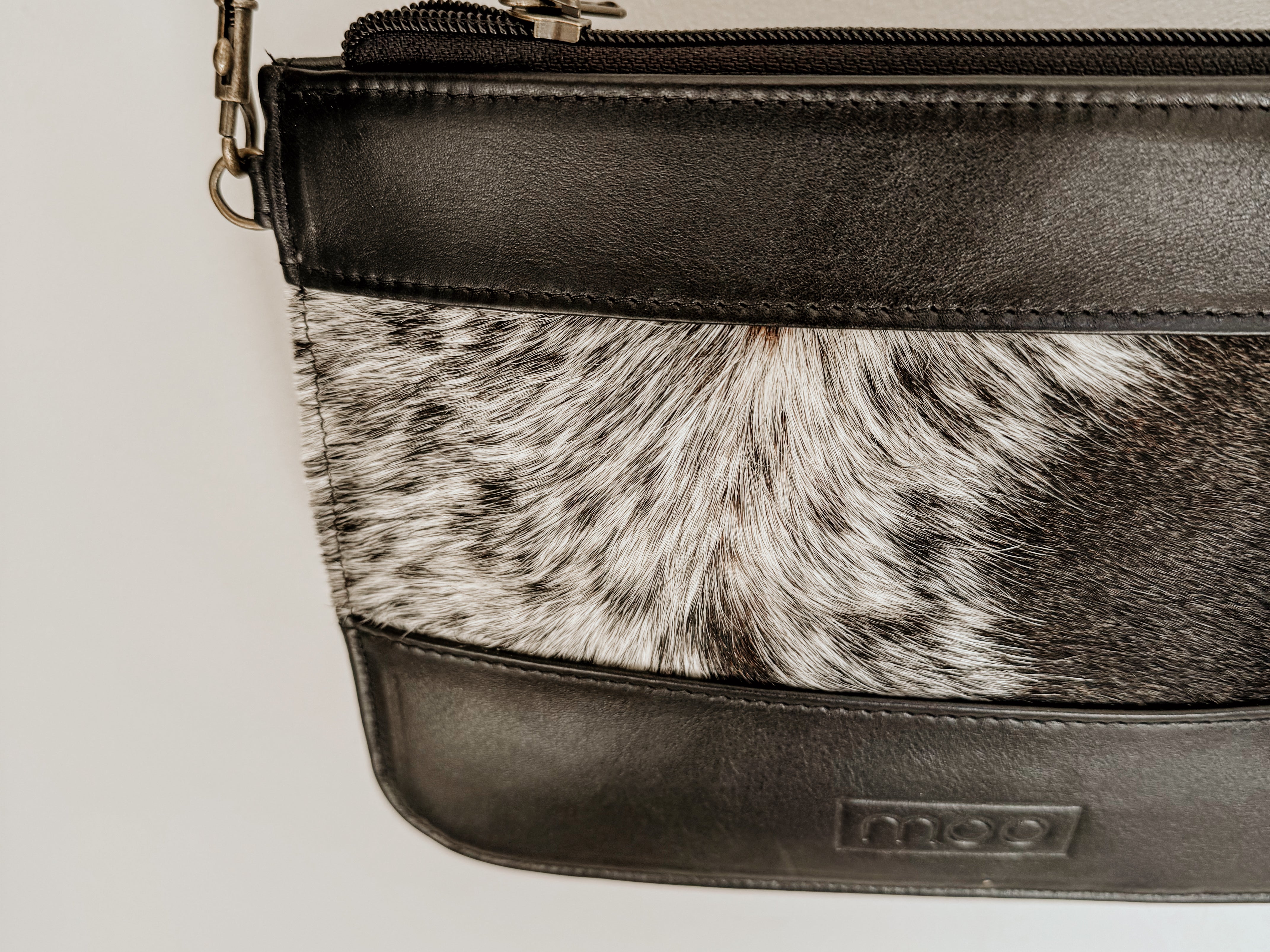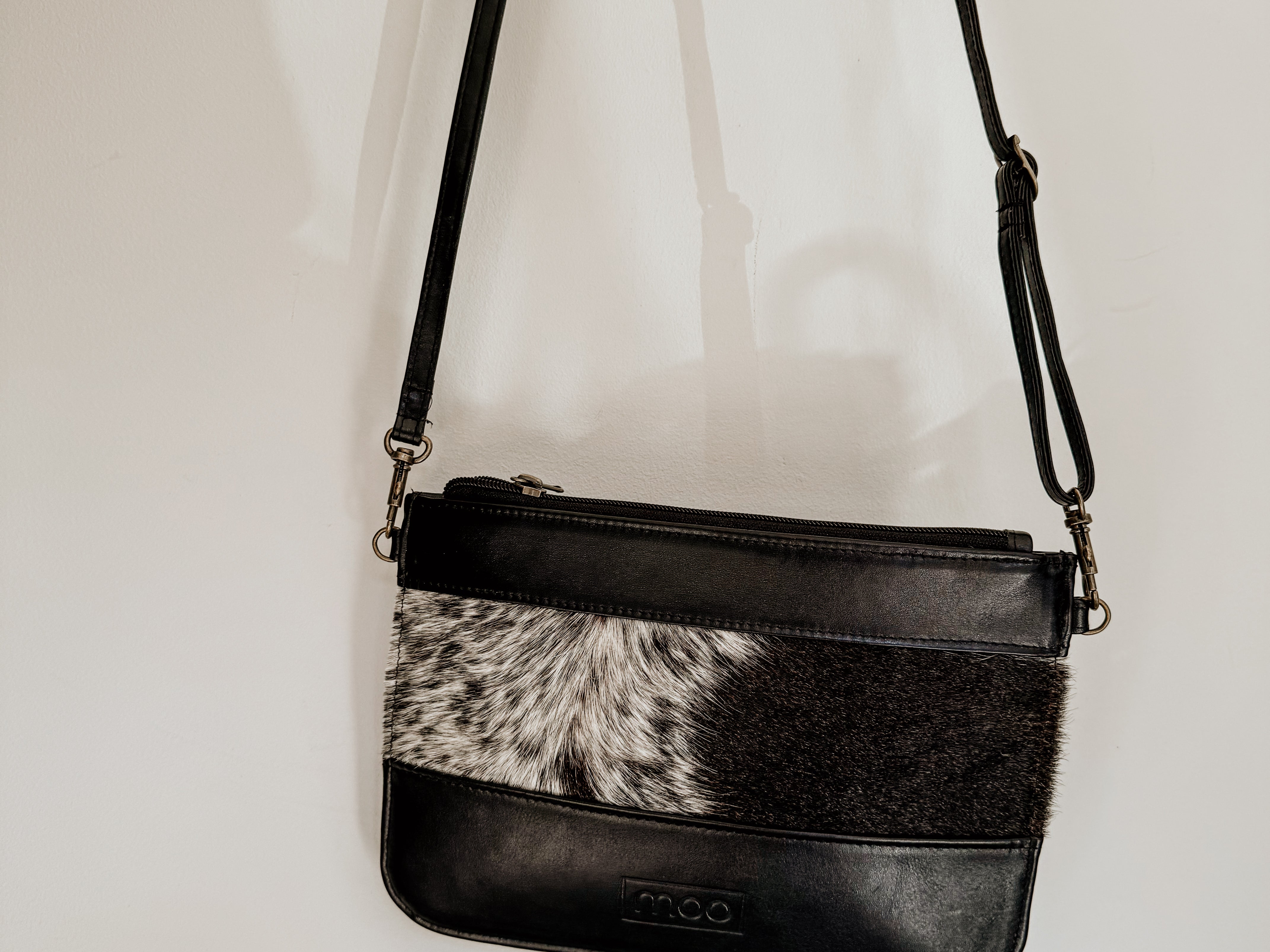 Moo-Molly Clutch Bag – a stylish blend of black and Nguni flair that's ready to accompany you on your adventures! Small and compact. Great from traveling. Great for gifting especially for international visitors.