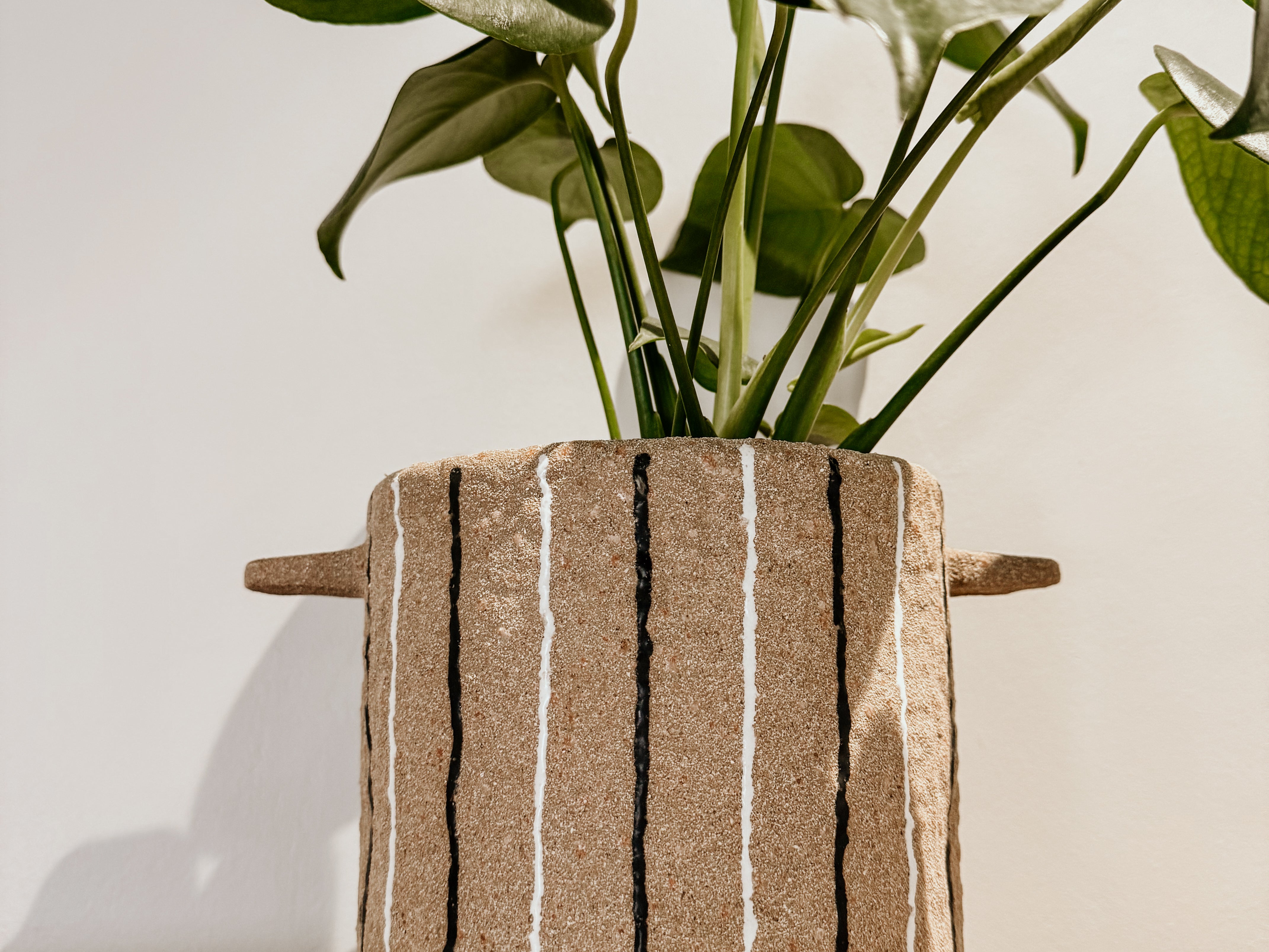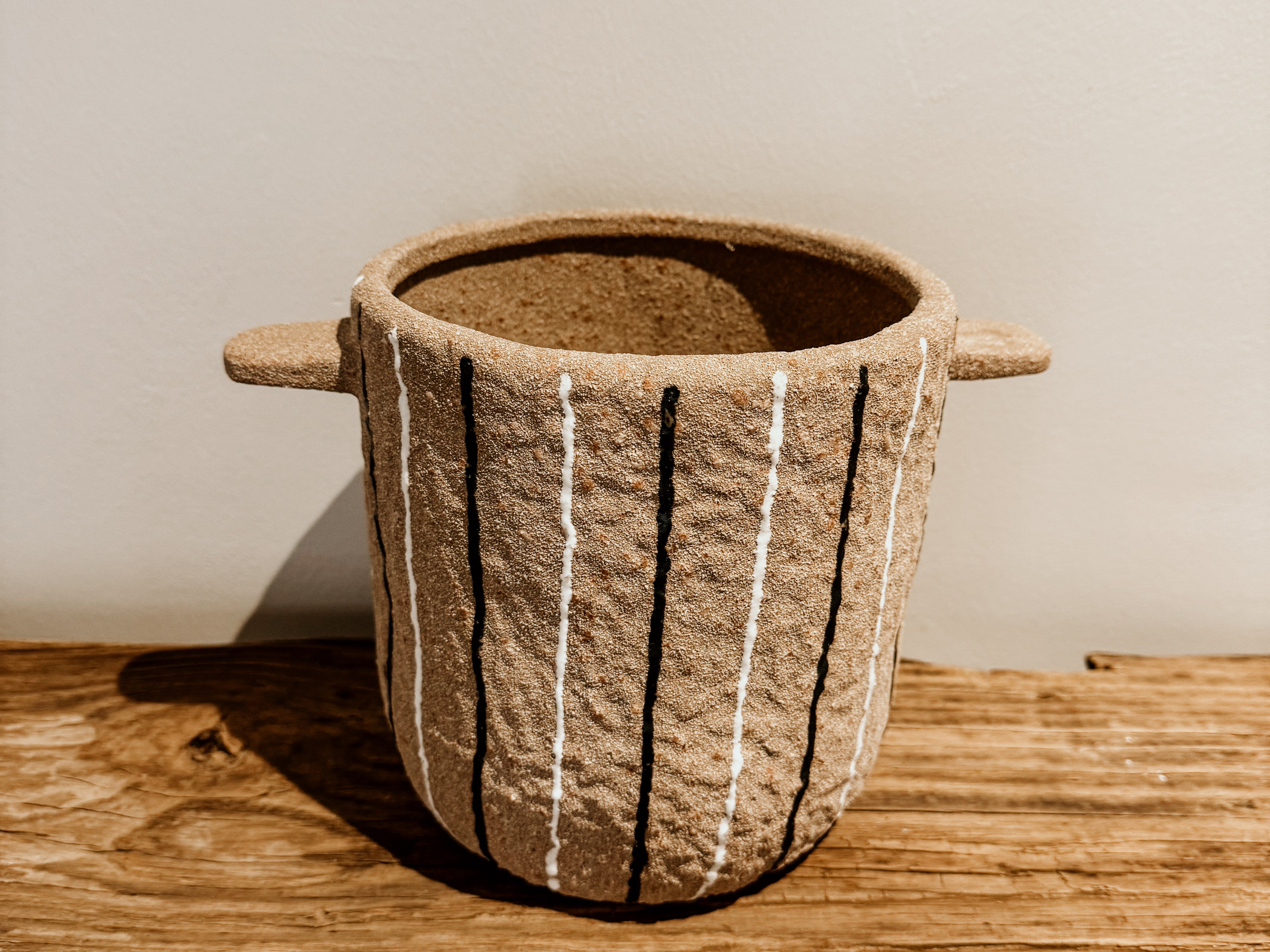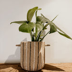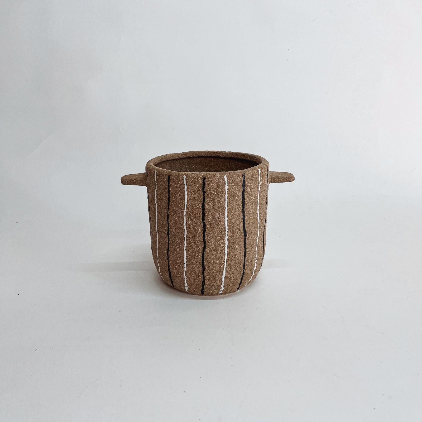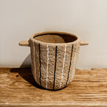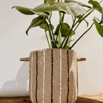 This terracotta pot, featuring bold white and black stripes, brings a rustic yet modern touch to any space. Its warm terracotta base paired with striking stripes makes it a standout décor piece, while the practical handles add both style and functionality. Perfect for plants or as a decorative accent, this pot adds character and warmth to your home.