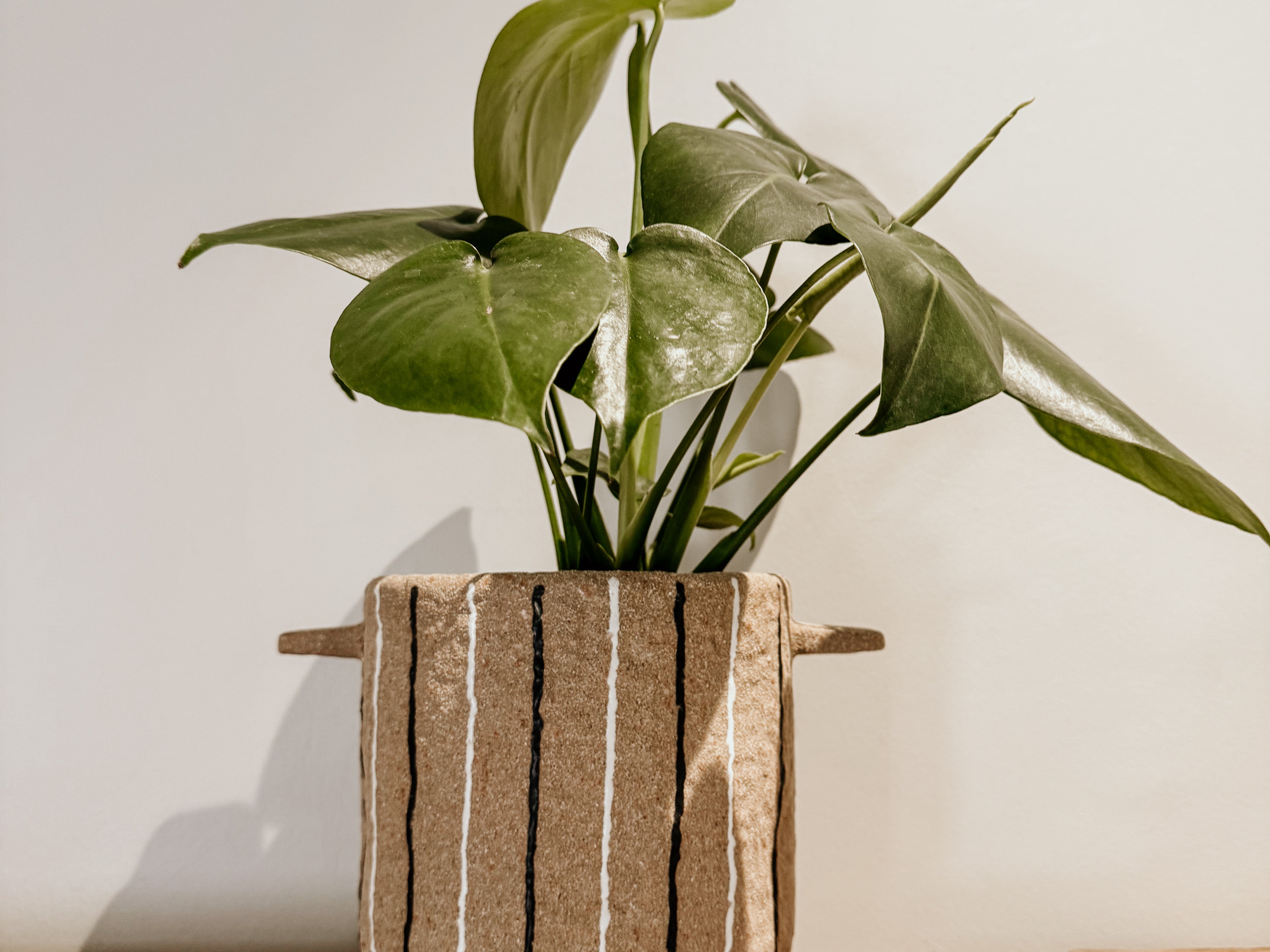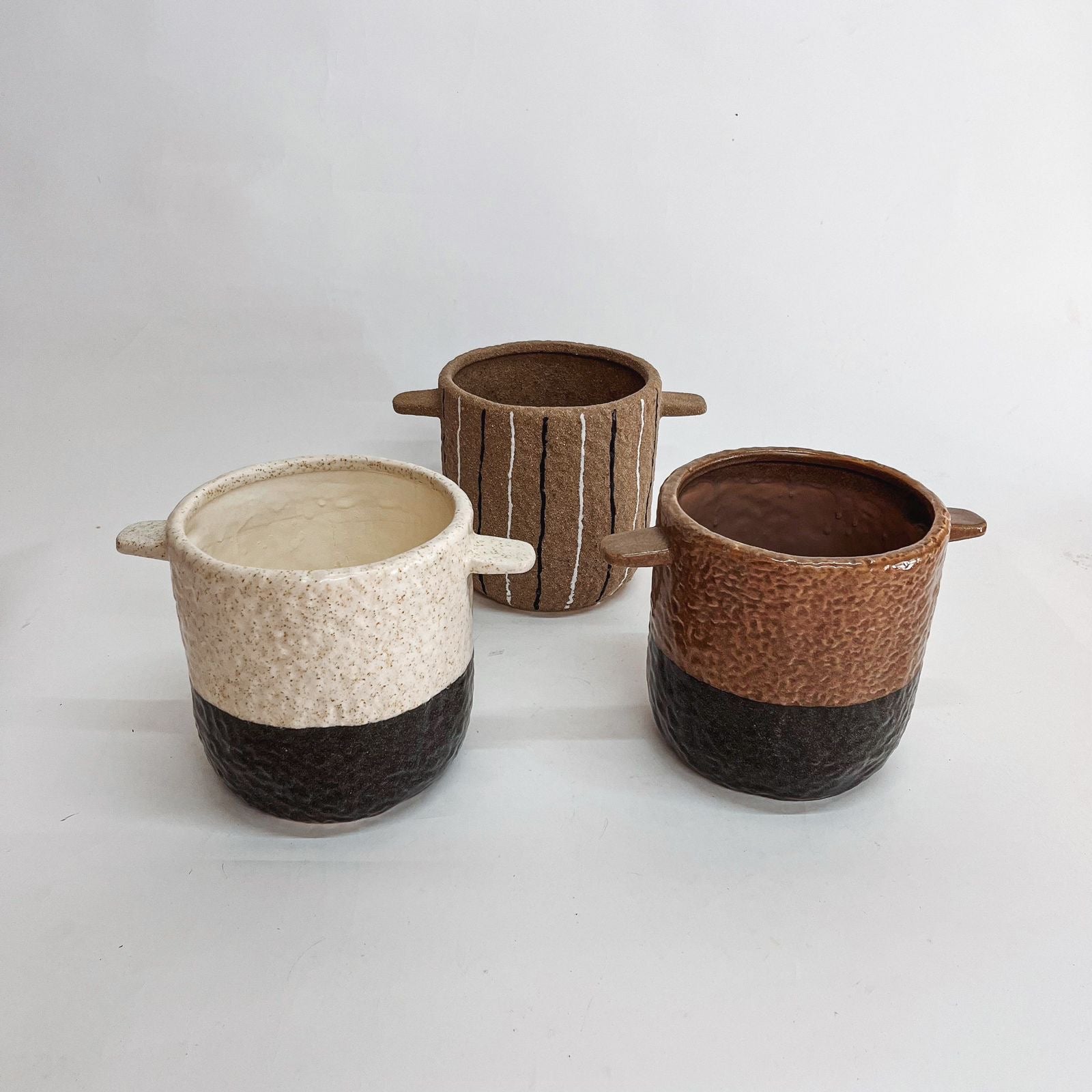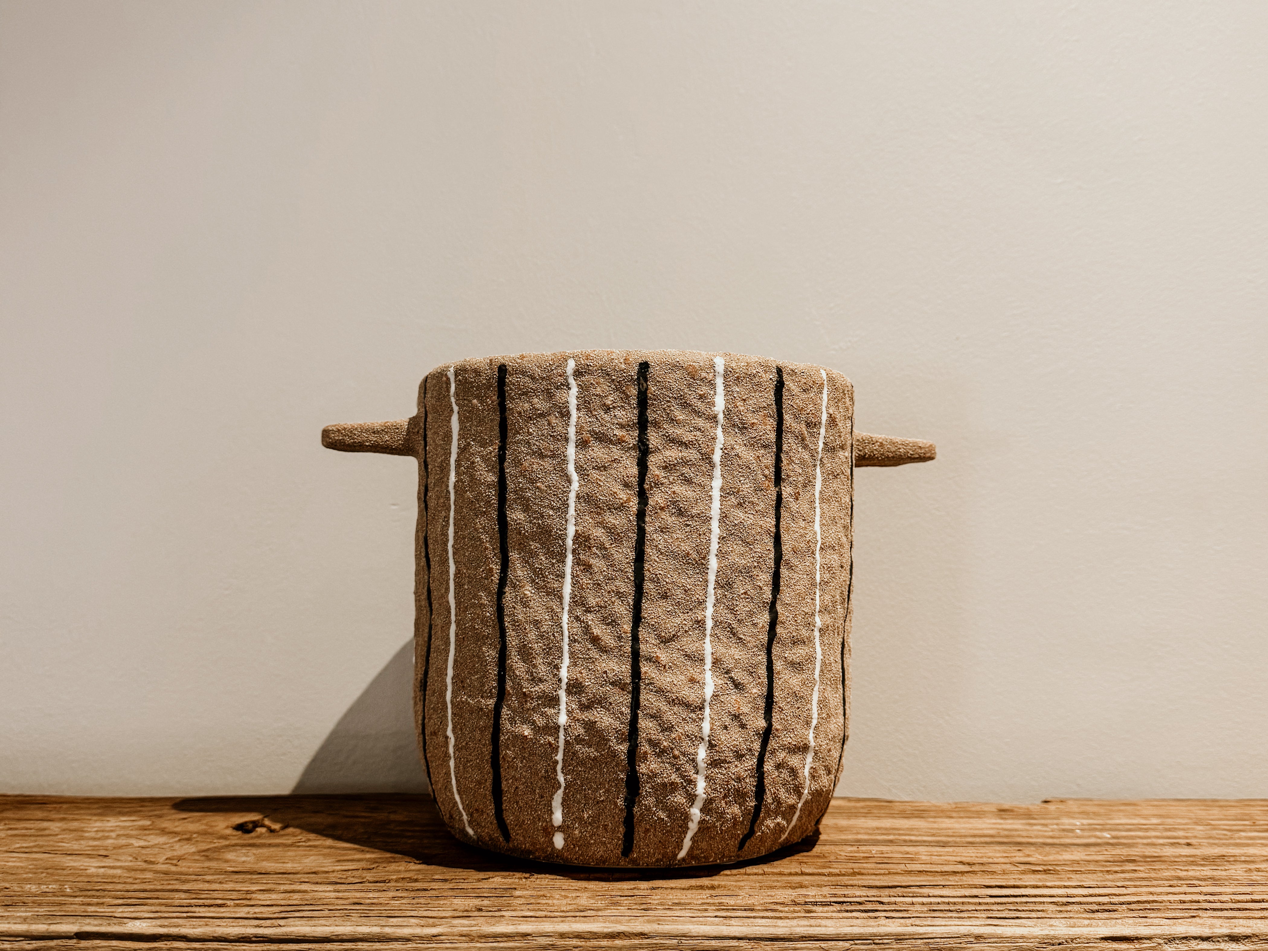 This terracotta pot, featuring bold white and black stripes, brings a rustic yet modern touch to any space. Its warm terracotta base paired with striking stripes makes it a standout décor piece, while the practical handles add both style and functionality. Perfect for plants or as a decorative accent, this pot adds character and warmth to your home.
