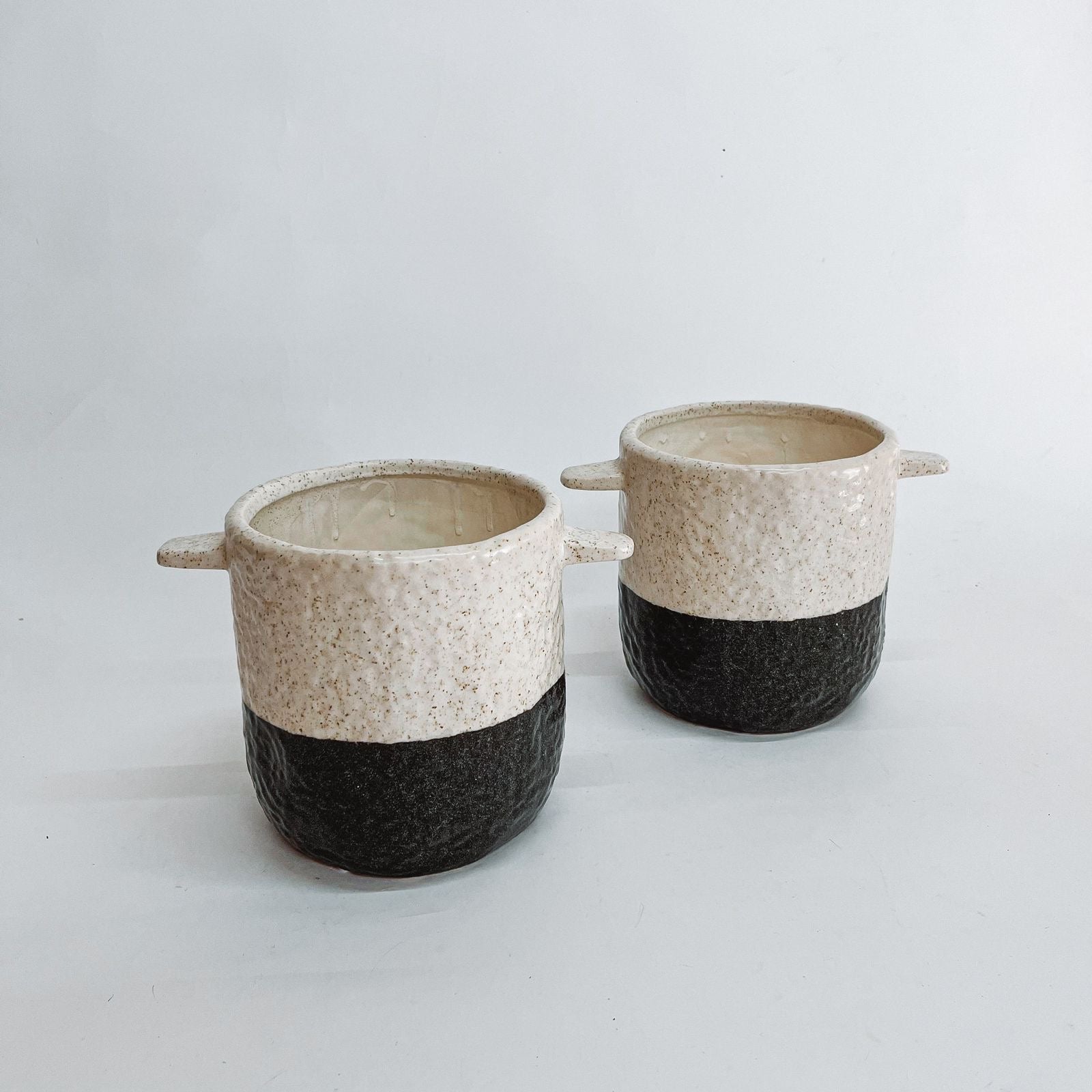 With its sleek two-toned design in cream and black, this pot exudes modern elegance. The contrasting colors create a bold yet balanced look, making it perfect for adding a touch of sophistication to any room. The convenient handles enhance its practicality, making it ideal for plants, storage, or décor.