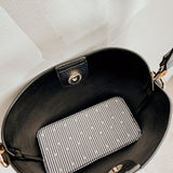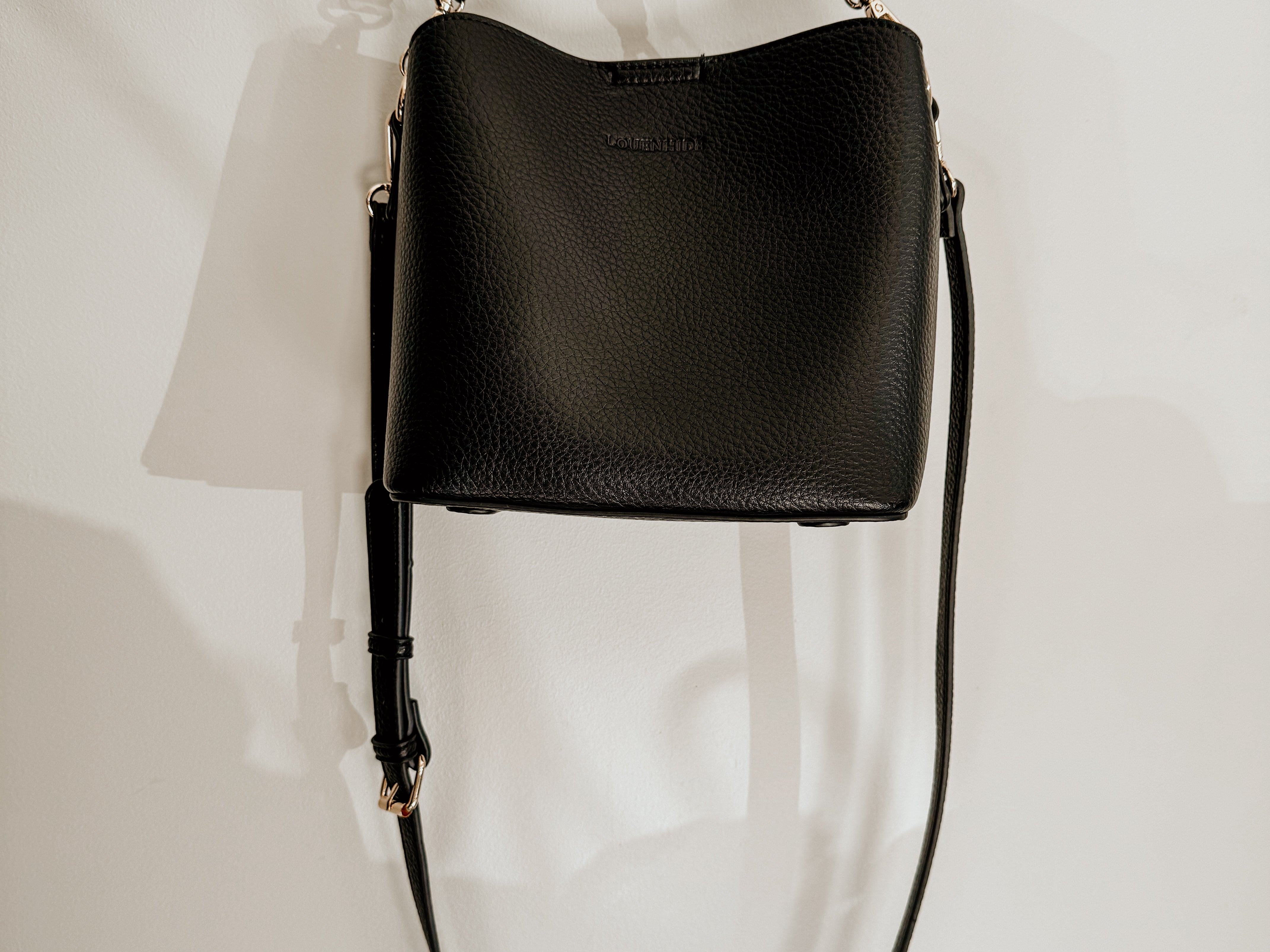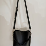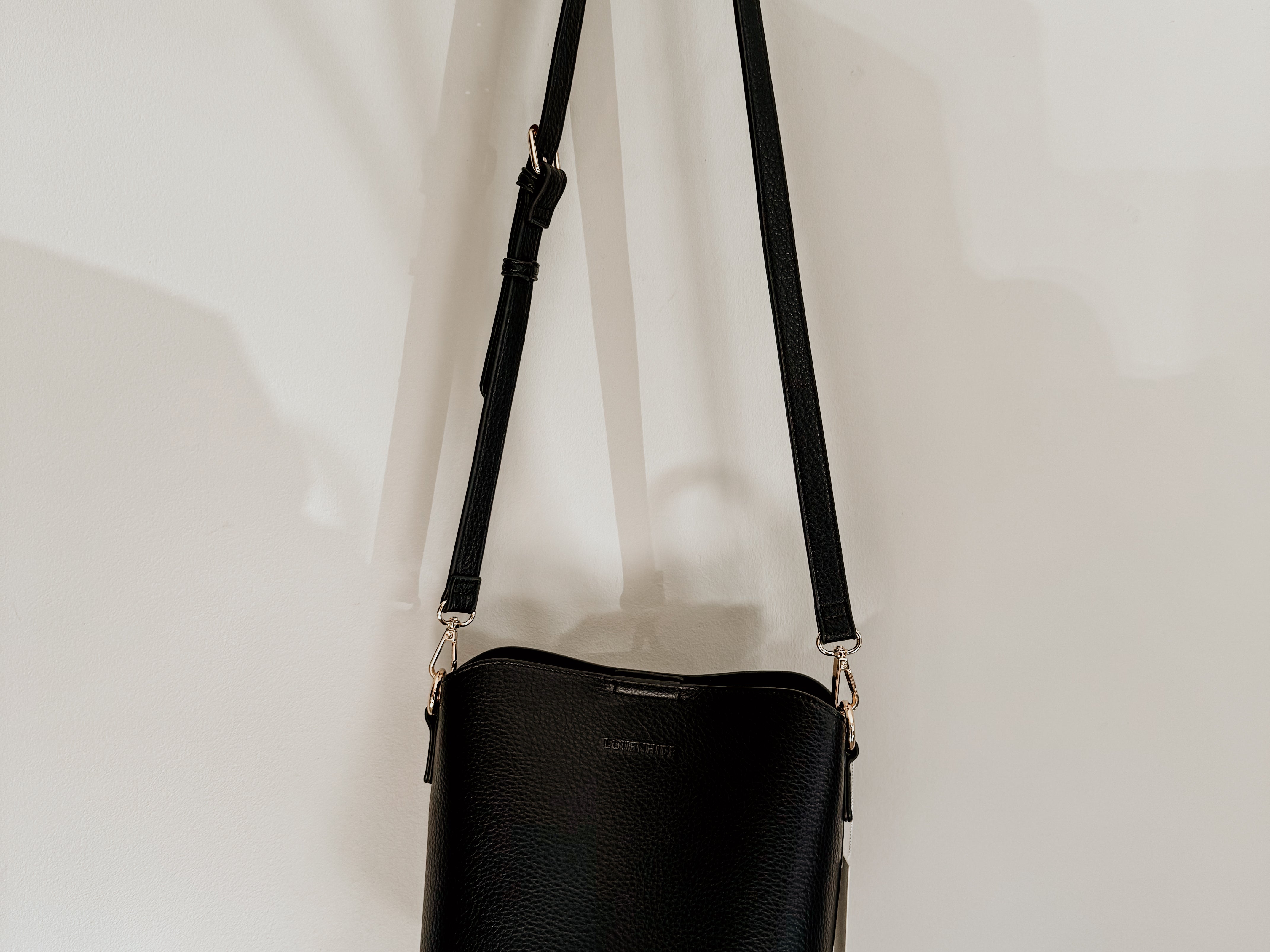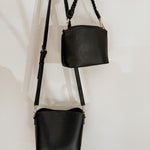 This mini bucket bag boasts a sleek, simple design that adapts easily between styles. It can be used as a small handbag or a crossbody bag with its interchangeable straps.