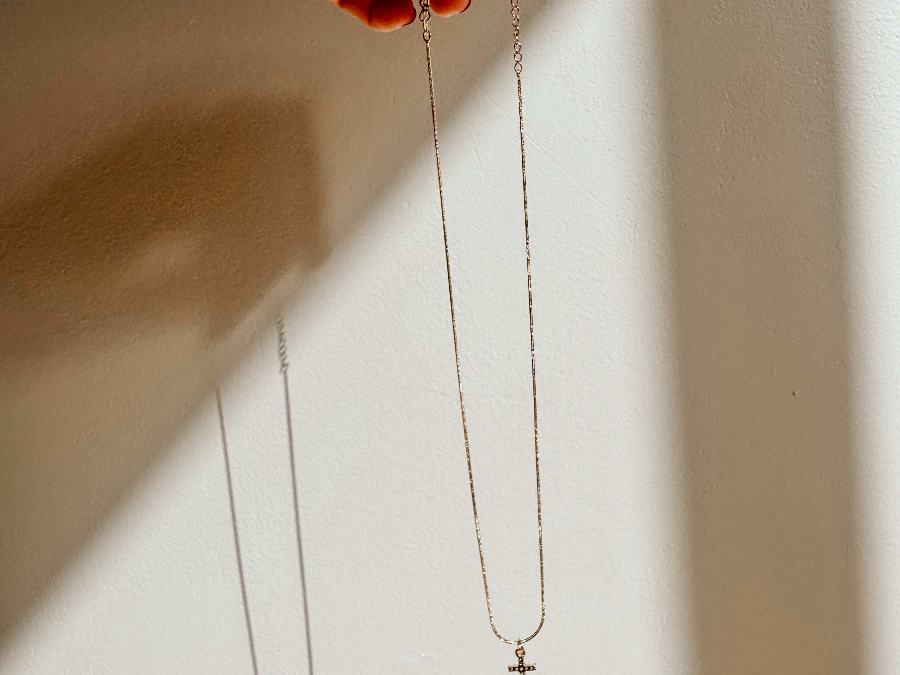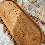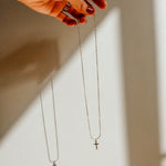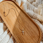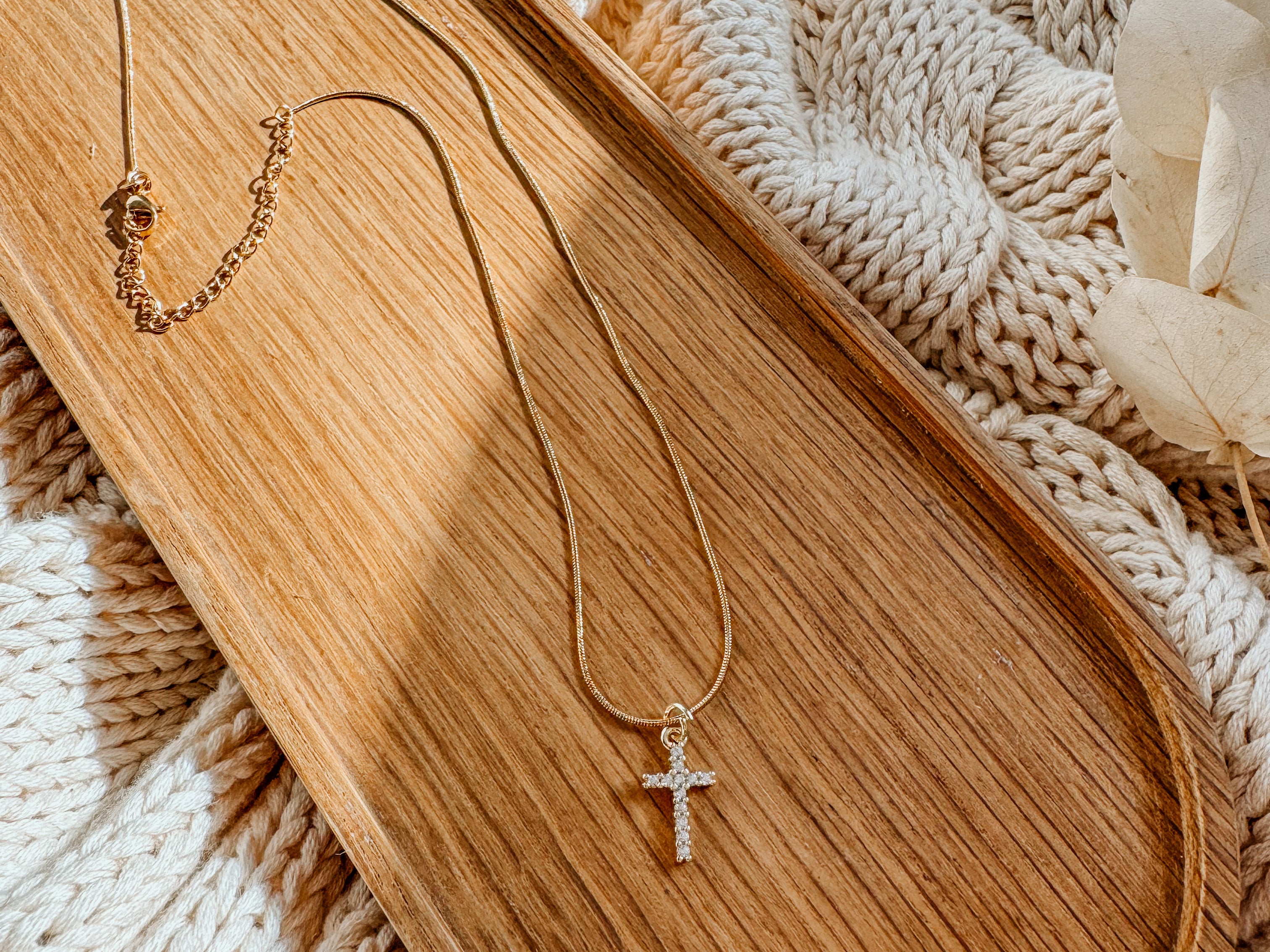 The Sparkle Cross Necklace gently catches the light with it's subtle addition of cubic stones. This dainty piece is perfect for those seeking a meaningful accessory that adds understated elegance to any look.